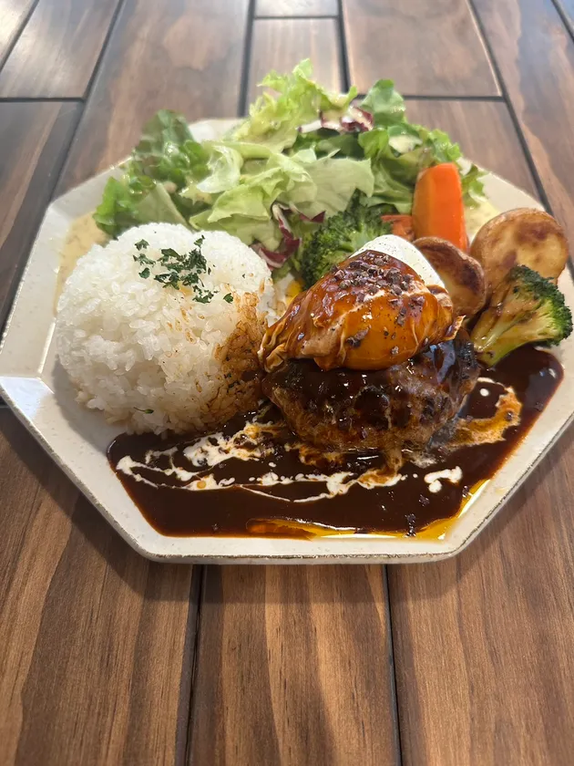 足柄牛のモモを始めとした部位を100%使用した旨味たっぷりなジューシーハンバーグに、コクのある三浦の赤たまごを使用したポーチドエッグを乗せました。その上から黒トリュフが香る濃厚な特製デミグラスソースをかけ、仕上げに砕いたカカオ豆を散らしてアクセントに。ポーチドエッグを割るととろーり黄身が溢れだします。期間限定の贅沢なハンバーグをお召し上がりください。