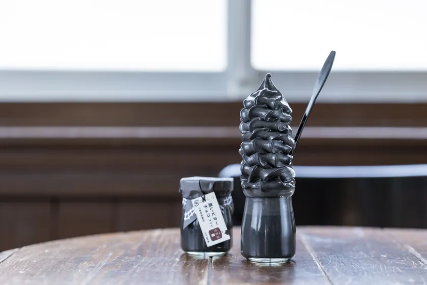 全長9.6kmの大雄山線。その路線に魅せられて誕生した「黒いビターチョコプリン」。さらに、その上に黒いチョコソフトをのせた「黒いプリンソフト」も大人でビターな味わいが楽しめる、駅舎カフェ限定スイーツです。