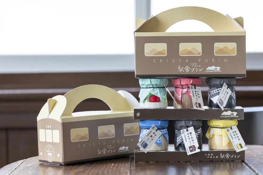 その他のお味もご用意している、レトロな瓶入りの「駅舎プリン」。かけ紙や切符風のタグ、1両編成の電車に見立てた箱などこだわりがぎゅっと詰まった、お土産にもピッタリな商品です。「カラメルプリン」「黒いビターチョコプリン」「コーヒー牛乳プリン」「クリームソーダプリン」「ミルクチョコプリン」の5種類が登場し、定番の味からちょっと変わったプリンまでお楽しみいただけます。