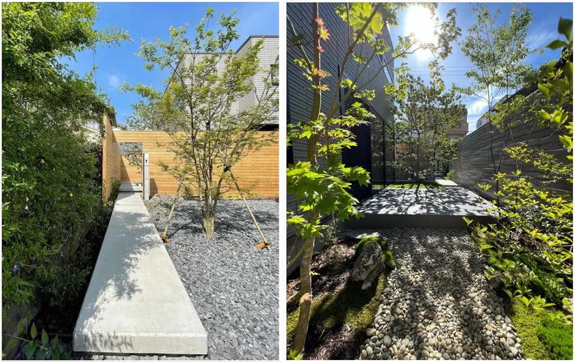 緑を眺めながら家に入るアプローチ(左)、プライバシーを確保した中庭(右)
