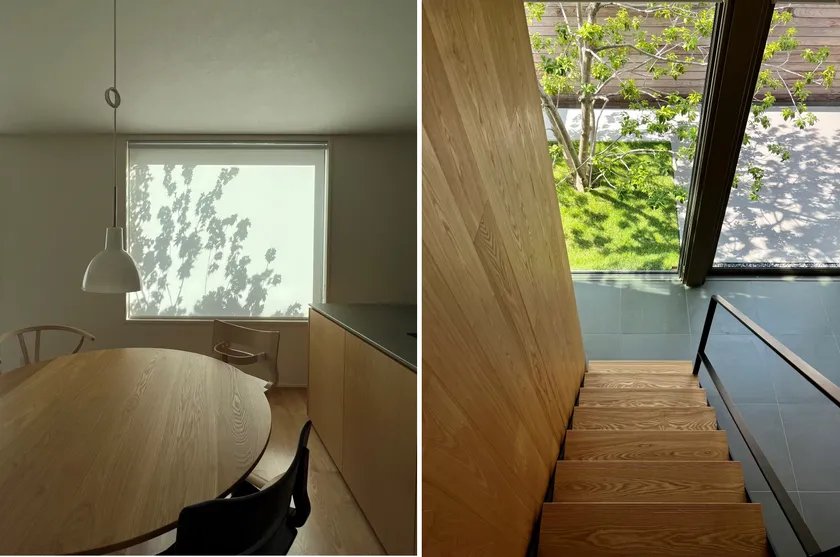 ロールスクリーンに映る緑が生み出す自然のアート(左)、視線の先の緑を見ながら1日がスタートする階段(右)