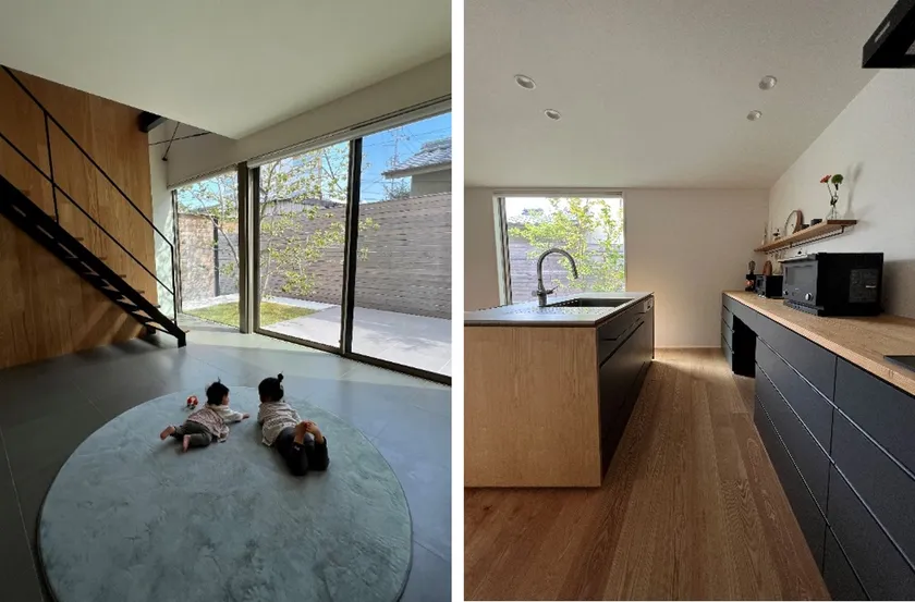 内と外とをフラットにしたつながりのある空間(左)、窓越しの緑を眺めながら「木のぬくもりを感じられる」キッチン(右)