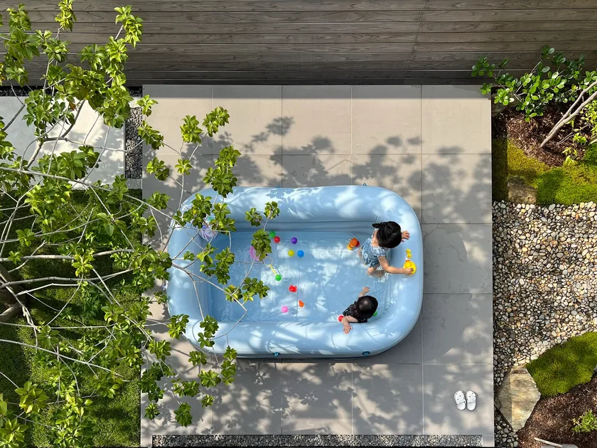 タイルに映るソヨゴの影を楽しみながら、プールで遊ぶ長女のE様と二女のS様