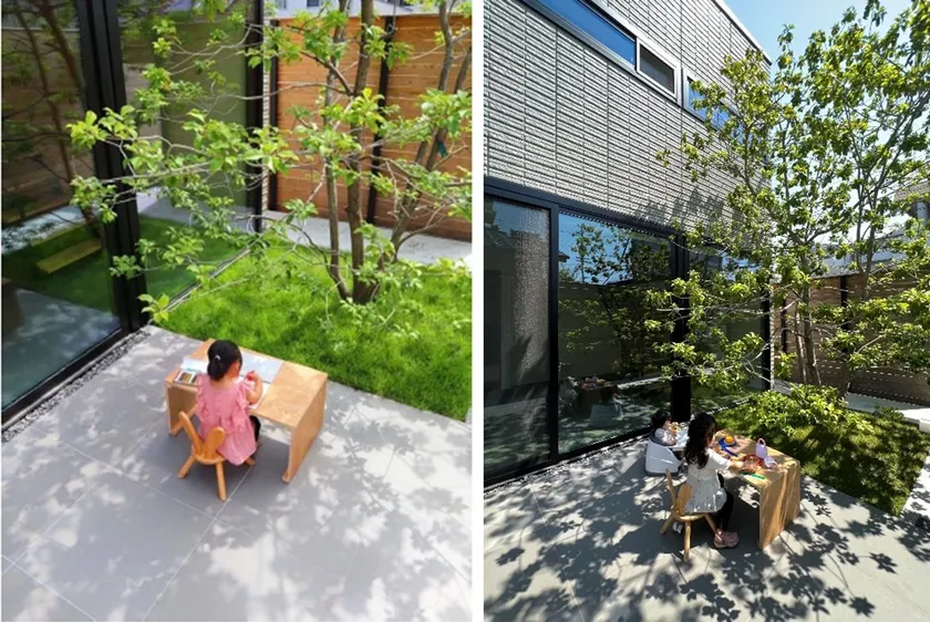 ソヨゴの下で手作りの机でお絵描きをする長女のE様(左)、中庭で過ごす日常の様子(右)