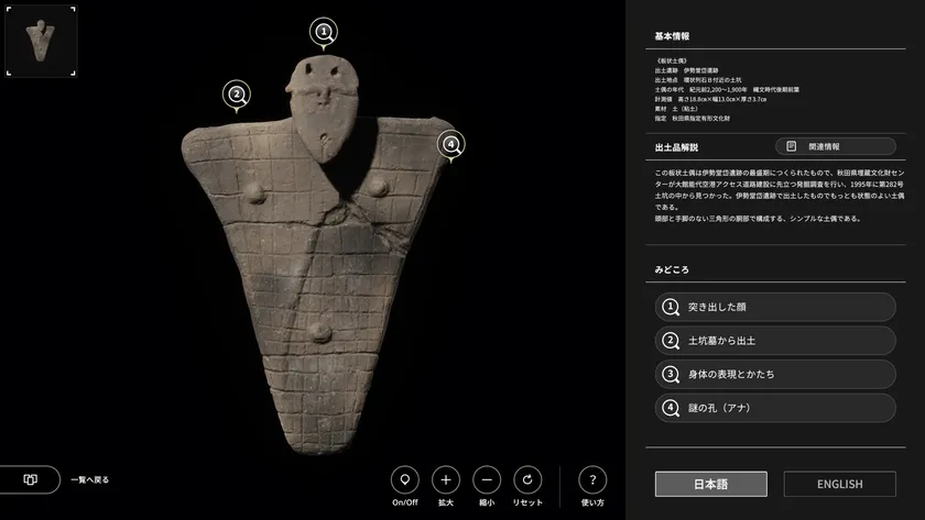 伊勢堂岱遺跡の出土品を手に取るように鑑賞できる、これまでにない貴重な体験が可能です。高精細デジタルアーカイブ技術によって質感や細かな文様を高精度に再現した出土品を、自身で操作しながら細部まで自由自在に鑑賞できます。現地で実際に展示されている出土品とあわせてご覧いただくことで、今に息づく縄文ロマンをご堪能いただけます。
