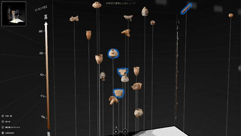キューブ型のインタフェースに集められた出土品の画像群は、出土した場所と、地層の深さを軸に構成されており、出土品同士の位置的なつながりや積み重ねられた歴史を視覚で感じられます。キューブの中から気になる出土品を選択すれば、その詳しい解説を閲覧することができます。また、関連キーワードで紐づけられた出土品同士からは、出土品への理解がさらに深まります。