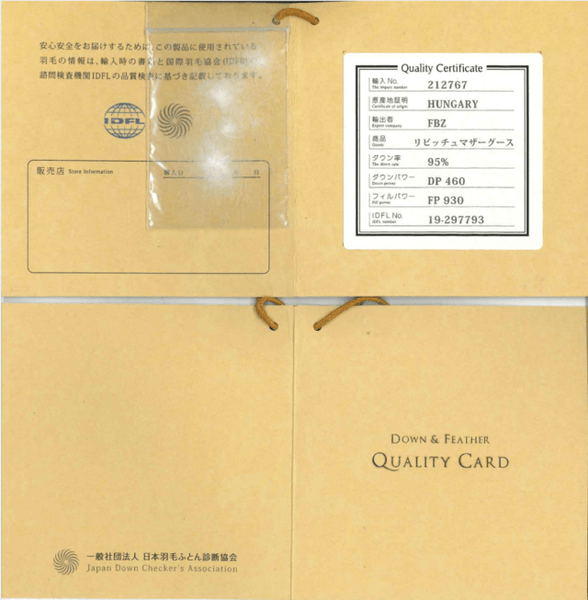 ダウン(羽毛)は国内・欧米それぞれの品質基準において最高レベルの「ハンガリー産リピッチュマザーグースダウン」を使用