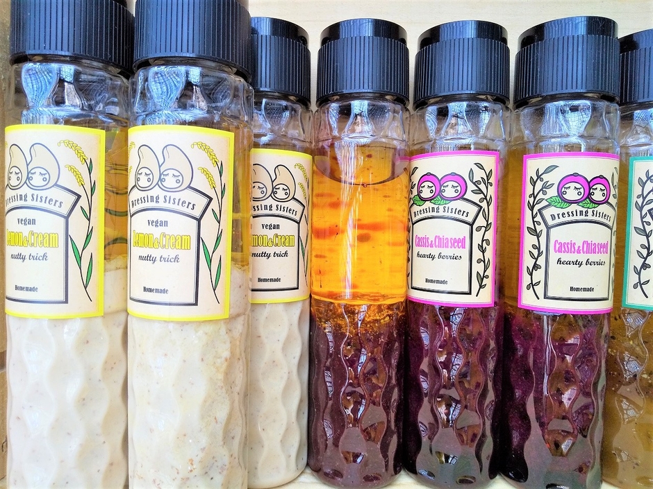 「Dressing Sisters」さんはホームメイドドレッシングのお店です。美味しいと思えるドレッシングを探している方にこそ、きていただきたい。レモンクリーム・カシスチアシード・カボスハーブなど珍しい組み合わせで、素材を引き立てます。