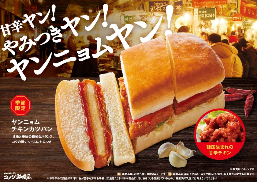 \甘辛ヤン!やみつきヤン!ヤンニョムヤン!/ 【コメダ珈琲店】食欲そそる甘辛ソースとチキンカツが絡む 「ヤンニョムチキンカツパン」を 2月24日(金)より季節限定で全国販売開始!