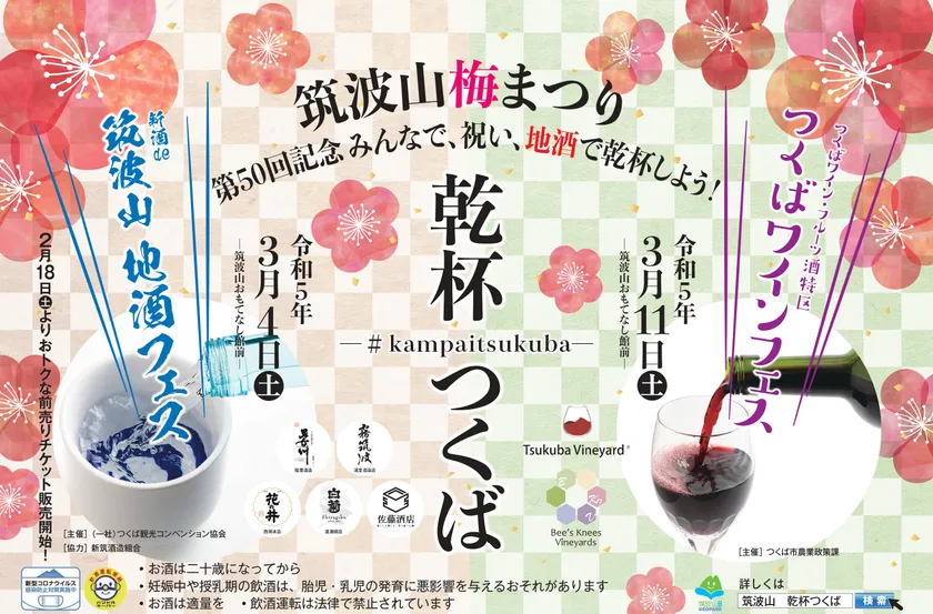 また、筑波山梅まつりは50周年を迎え、筑波山・つくばの地酒で祝う「乾杯つくば」を開催します。筑波山水系の新酒の地酒やつくばワイン・フルーツ特区のワインをお楽しみいただけます。