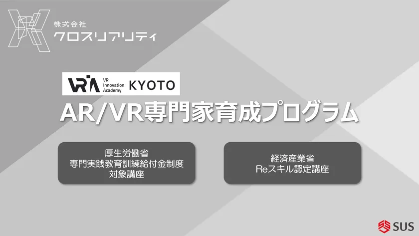 株式会社エスユーエス(本社:京都市下京区、代表取締役社長:齋藤 公男)の子会社である株式会社クロスリアリティ(本社:京都市下京区、代表取締役社長:齋藤 公男)が提供する、「AR/VR専門家育成プログラム」(以下、当講座)が、厚生労働省の専門実践教育訓練給付制度および経済産業省の第四次産業革命スキル習得講座(Reスキル認定講座)に認定されました。