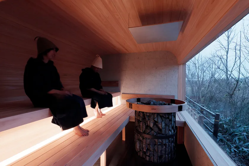 『SEN』に泊まった方だけが楽しめるプライベートサウナ。河岸段丘の森、樹齢500年以上の大ケヤキを望む場所にアウトドアサウナを作りました。体感温度を調節するフィンランド式のセルフロウリュで、6名様まで一緒にサウナをお楽しみいただけます。天井は徹底した断熱を施した上で檜板を貼り、壁には蓄熱効果の高い十和田石を貼りました。さらにもう一つ、建物内にもセルフロウリュ可能なサウナを。こちらは定員2名。岩をくり抜いて作った野趣あふれる水風呂も備えています。 朝晩で2つのサウナを、男女分かれて、2家族で分かれてなど、さまざまな形でお楽しみください。