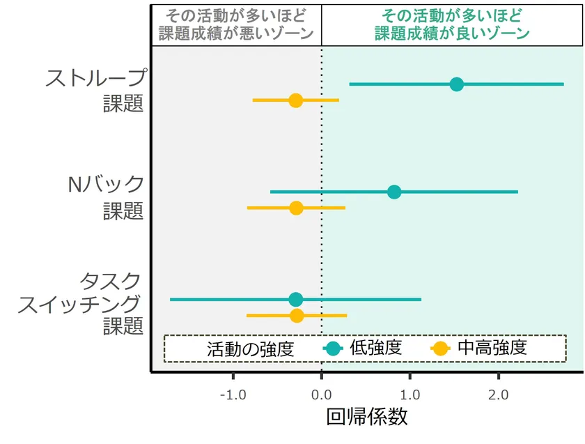 分析の結果、1日に占める低強度の身体活動の時間が長いほど、抑制機能を評価するストループ課題の成績が高いことがわかりました。また、統計学的予測により、座位行動や睡眠時間を1日30分減らして、低強度の身体活動に充てることでストループ課題成績が5-10%程度高くなることが試算されました。一方、運動やスポーツといった比較的強度が高い活動(中高強度の身体活動)と実行機能の間に、統計的に有意な関連性は確認されませんでした。また、ワーキングメモリや認知的柔軟性を評価する課題の成績は、いずれの強度の身体活動とも明確な関連性が確認されませんでした。