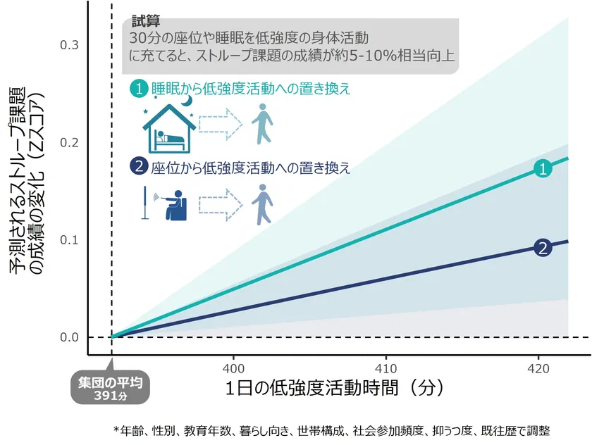 ※3. 統計学的な予測:集団の座位行動/睡眠時間の平均値を1日30分減らして、代わりに低強度の身体活動時間を30分増やした場合に、実行機能の課題成績がどのように変化するかを予測しています。よって、この結果を個人に当てはめることはできません。