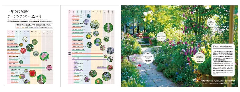 第2章では、庭の植物選びの基礎知識にはじまり、「季節を咲き継ぐ植物図鑑」として、季節の見どころとなる主役級の花から、名脇役の小花やリーフ、グラウンドカバーまで、庭作りや寄せ植えに活躍する厳選した草花を137種一挙公開。庭仕事に欠かせないガーデングッズの紹介や、一目瞭然で咲き継ぐ流れが分かるフラワーカレンダーも掲載しています。