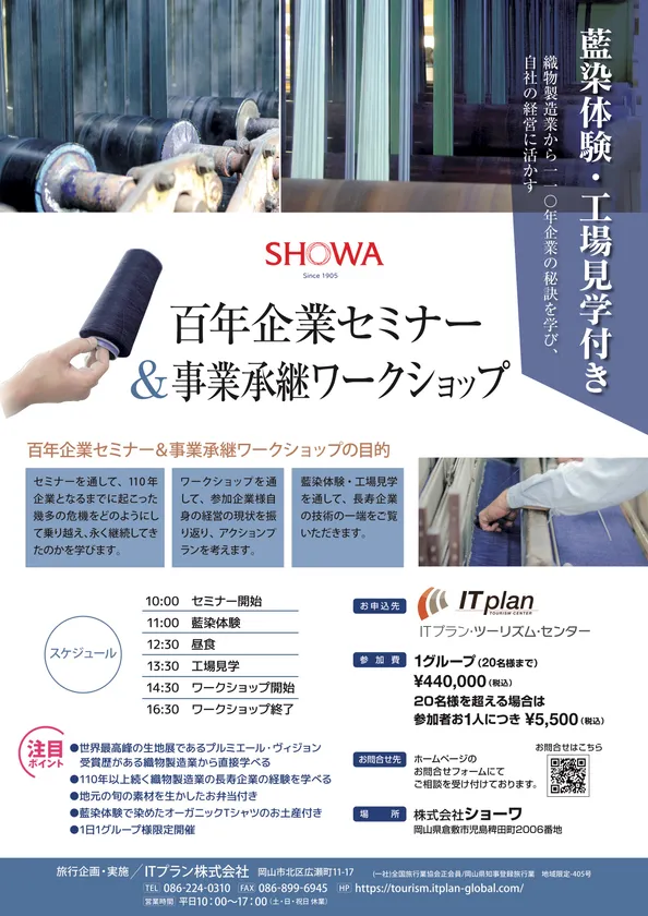 ITプラン株式会社(本社:岡山県岡山市、代表取締役:太田 記生)は、織物製造業の株式会社ショーワ(本社:岡山県倉敷市、代表取締役社長:片山 真一朗)と共同企画した「百年企業セミナー&事業承継ワークショップ」の販売を開始いたしました。