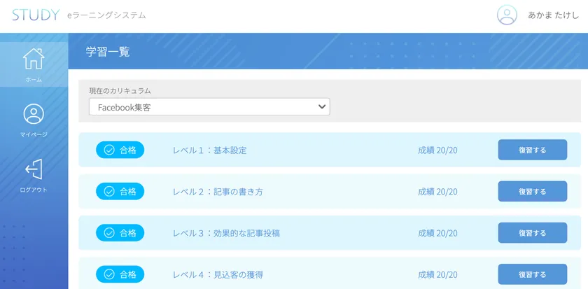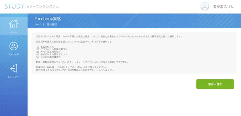 「STUDY」のカリキュラム開始時画面(例)