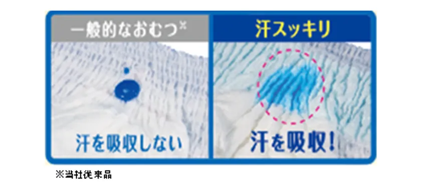 そこでこのたび、お肌の汗の残りを99%カット※1する“汗吸いとるシート”を紙おむつの背中側に搭載した『ムーニーマン 汗スッキリ』を、全国で期間限定品として発売します。