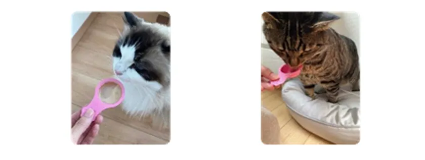 (1)ねこちゃんが食べやすく、中身がこぼれにくいスプーンタイプの容器です。