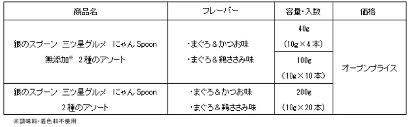 そこでこのたび、このような飼い主様の声にお応えして、『銀のスプーン 三ツ星グルメ』にゃんSpoonから、“無添加※2種のアソート”を発売します。