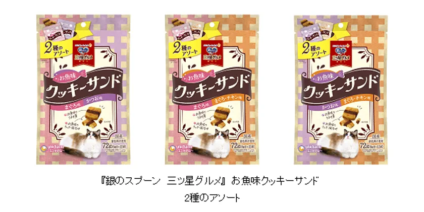 ユニ・チャーム株式会社(代表取締役 社長執行役員:高原豪久)は、猫用ドライおやつに対する「複数の味を与えたい」「ひとつの袋に複数の味が入ったものが欲しい」という飼い主様のご要望にお応えし、『銀のスプーン 三ツ星グルメ』 お魚味クッキーサンドから“2種のアソート”を、2023年3月13日に全国で発売します。