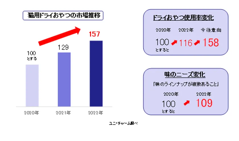 猫用ドライおやつ市場は、在宅時間の長時間化により愛猫と触れ合う時間が増えたことで拡大しています。