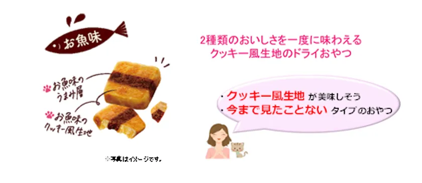 (1)お魚味のうまみ層がサンドされたクッキー風生地のおやつです。