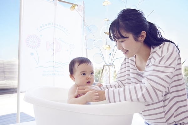 熱海の絶景と温泉に浸るリゾートホテル「星野リゾート リゾナーレ熱海」では、2021年12月1日~2022年2月23日の毎週水曜日に、子どもの温泉デビューと思い出づくりができる貸切温泉宿泊プラン「はじめてのおんせん」を販売します。貸切の大浴場「明星の湯」や客室にて、子どもの温泉デビューを叶えます。温泉デビューに必要なアイテムや、思い出づくりができるコンテンツを取り揃えた宿泊プランです。