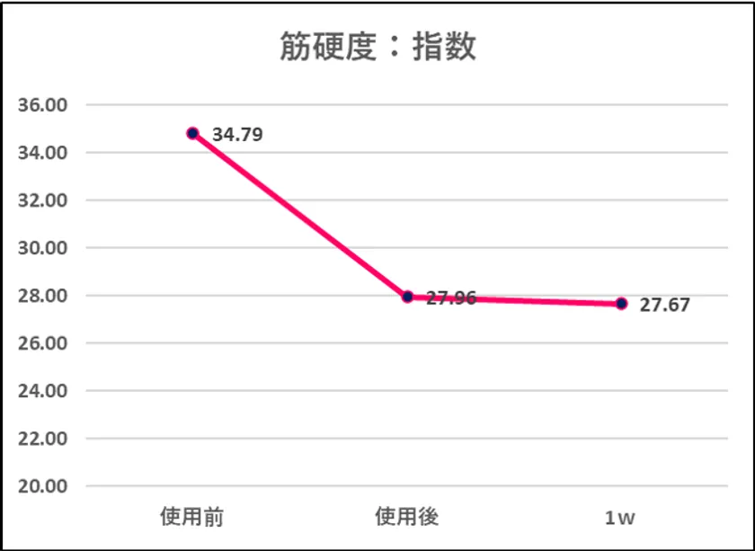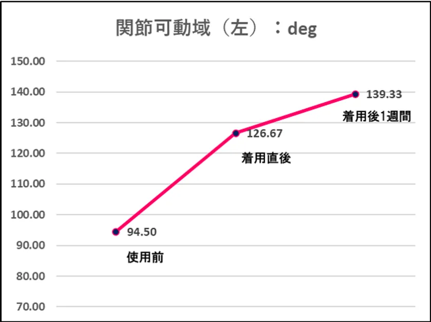 筋肉のこわばりが緩むことで、関節が動きやすくなります。この効果もTシャツで確認されており、約35%も可動域が拡大するという測定結果を得ています。実際に、前述の通り「脚が挙がりやすい」という実感を得られています。