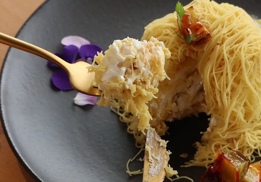 仕上げには表面をパリッとブリュレした、ダイス状の濃密な味わいの焼き芋を散らし、食感のアクセントとなるよう工夫しました。多層仕立てで見た目だけでなく断面も美しい、ボリュームたっぷりの絞りたてお芋モンブランです。