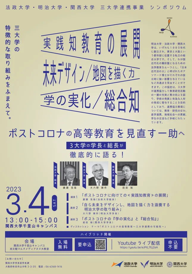 明治大学・法政大学・関西大学(以下、3大学)は、三大学連携事業シンポジウム「ポストコロナの高等教育を見直す一助へ」を、3月4日(土)に関西大学千里山キャンパスにて、ハイブリッド方式(対面・オンライン)で開催します。