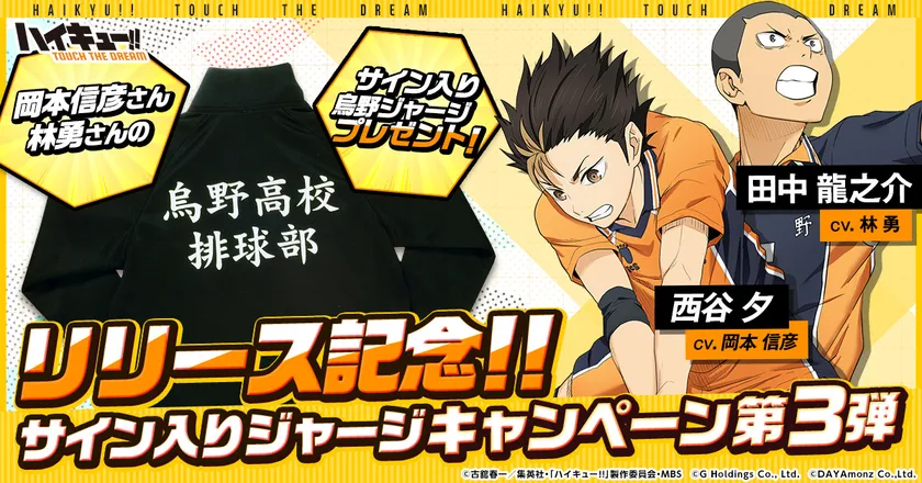 リリースを記念して本日より西谷夕役の岡本信彦さんと田中龍之介役の林勇さんのサイン入り烏野ジャージプレゼントキャンペーンを開始いたしました。キャンペーンはTwitterから参加できますので、お見逃しなく!