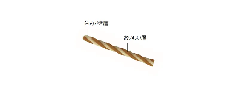 一方、TPPとお茶成分配合の歯みがき層と愛犬・愛猫が喜ぶエキス配合のおいしい層をねじって作った「愛犬・愛猫用かため・やわらか」。それぞれ異なる役割のある2層を噛むことで歯垢をとり、お口のニオイをスッキリさせながら、おいしく歯みがきができます。