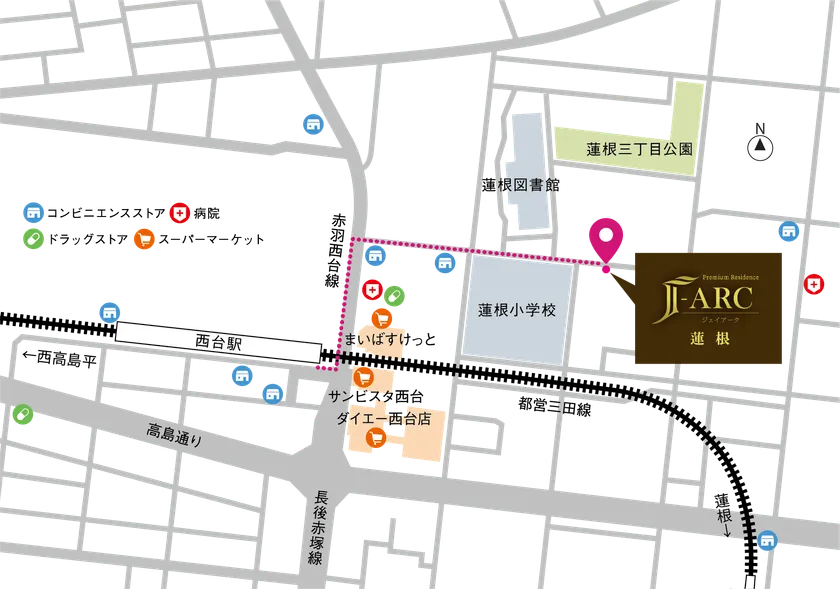 「J-ARC蓮根」は、都営三田線「西台」駅より徒歩5分で、大手町や日比谷など都心の主要駅へアクセスしやすく、交通利便性の良い好立地にございます。