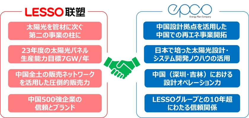 当社グループといたしましては、再生可能エネルギー(太陽光発電)の普及は日本のみならず世界的な潮流である中、日本市場は東京電力エナジーパートナー株式会社との合弁会社であるTEPCOホームテック株式会社を中心に業績拡大を図り、中国市場はLESSOとの協業により業績拡大を図る方針です。本協業は、中国市場における太陽光発電事業拡大の重要な足掛かりとして捉えております。