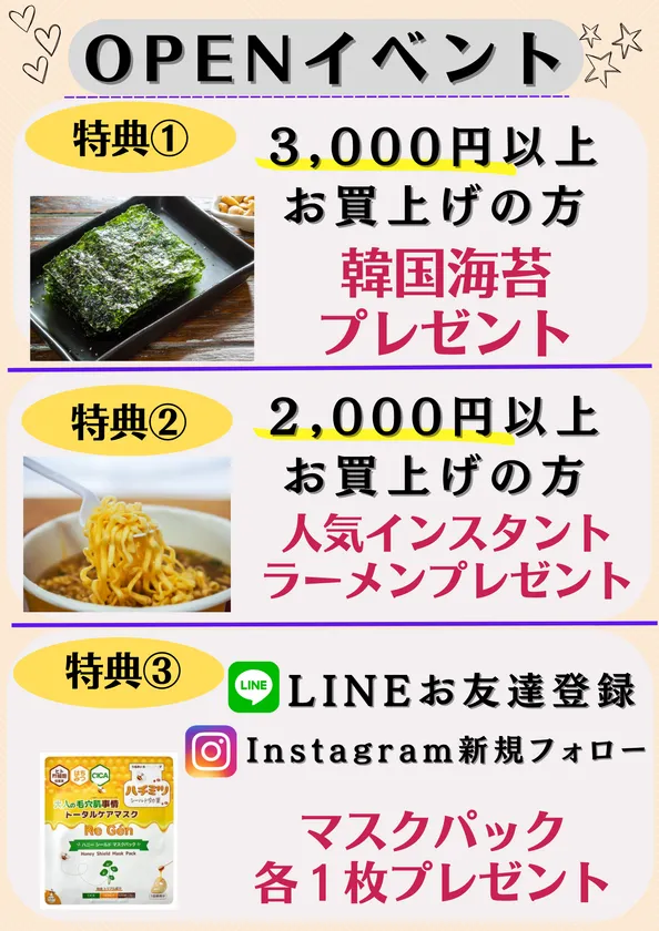 3,000点以上の野菜・キムチ・麺類・韓国のり・調味料・ソフトドリンク・お酒・お菓子・冷凍食品・お餅・健康食品・雑貨・化粧品など、軽食にピッタリなものから業務用の本格食材までユニークな韓国食品が品揃え豊富で、日本にはない韓国食品と出会うことができます。日本の韓国料理屋で提供されている本格的な韓国食材を、好きなだけ購入できるのもポイント!