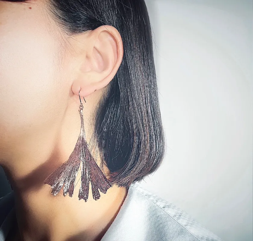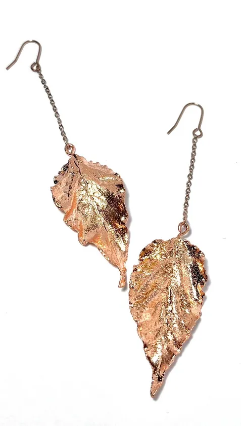 商品説明 :本物の植物の葉に光沢のある銅をあしらったイヤリング。