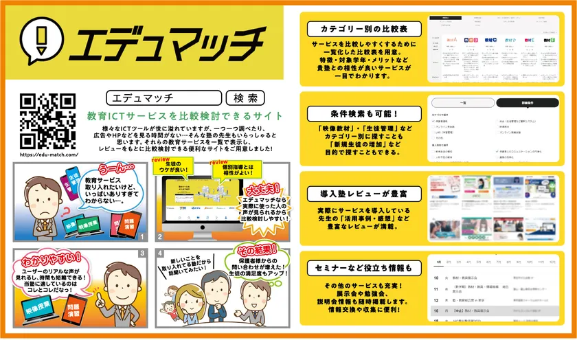 エデュマッチ事務局(共同代表:佐藤 雄太・田口 健吾)は、塾の先生おすすめICTツールの紹介レビューサイト「エデュマッチ」について2023年2月17日(金)に開設、および先行公開しました。