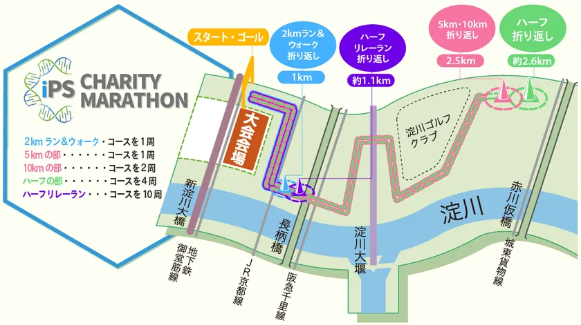 本大会は、iPS細胞を「次世代へつなぐ」スポーツイベントをコンセプトに、マラソン大会の開催を通じて、公益財団法人京都大学iPS細胞研究財団(R)(iPS財団(TM))の活動を支援します。iPS財団が進めているiPS細胞の実用化を目指した事業をサポートするため、参加費の一部(1名あたり400円)を同財団に寄付します。