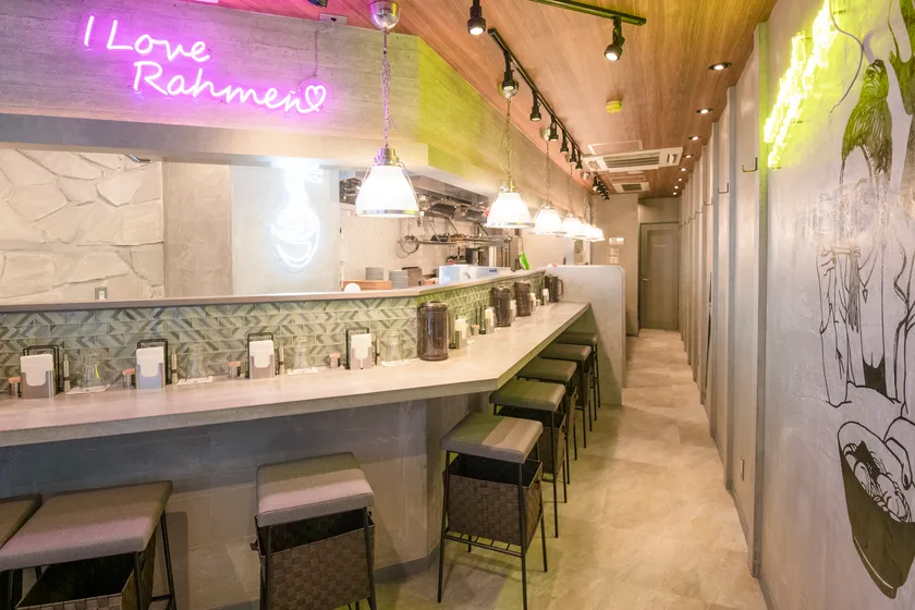 塩ラーメンをベースにゆず塩ラーメン、チーズそぼろまぜそばをご用意。洋風とネオンで装飾された店内で、おしゃれな雰囲気に仕上がっております。