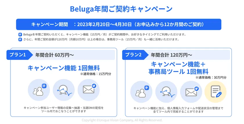 ユニークビジョン株式会社(所在地:東京都渋谷区、代表取締役社長:白土` 良之、以下 ユニークビジョン)は、当社が提供するSNS統合管理ツール「Beluga」において、2023年2月20日~4月30日の期間限定で、年間ご契約キャンペーンを実施いたします。