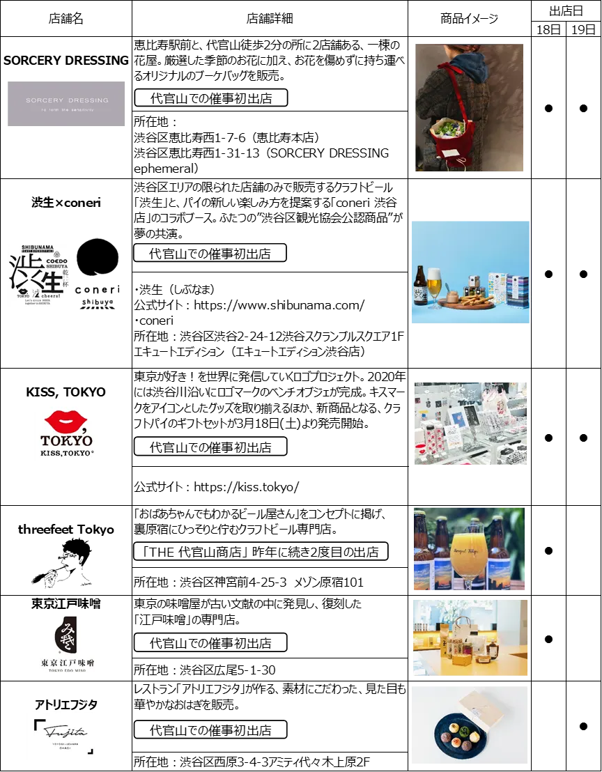 渋谷区内限定で販売されるクラフトビール「渋生」と、パイ専門店「coneri」のコラボブースが代官山に特別出店いたします。渋谷区の魅力を存分にお楽しみいただけるコラボ商品「渋谷で乾パイセット」に、ぜひご注目ください。また、代官山での催事初出店となる、味噌専門店「東京江戸味噌」やこだわりのおはぎを販売する「アトリエフジタ」など、注目店舗が計6店舗出店いたします。