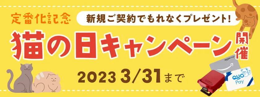 smartプラス「にゃんモデル」の定番モデル化を記念して、smartプラス「にゃんモデル」を新規ご契約いただいた方全員に、“にゃに(何)かの猫グッズが当たる!猫の日プレゼントキャンペーン”を開催いたします。