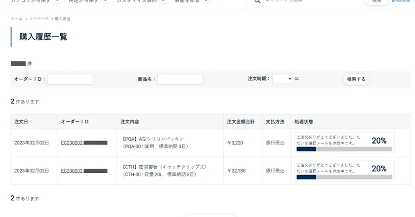また、ご購入履歴をベースに「この製品に合うパッキンを買い替えたい」「この時とまったく同じ仕様の容器が欲しい」といったやり取りが可能になるため、非常にスムーズかつ誤購入の防止になります。