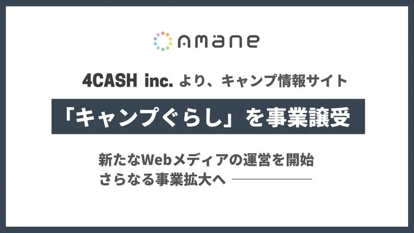 株式会社Amaneは「次のスタンダードを創る。」をビジョンに掲げ、Webメディア運営を中心に様々な事業を展開してまいりました。さらなる事業拡大に伴い、「キャンプぐらし」を運営する合同会社フォーキャッシュと交渉を進め、この度当事業を譲受する運びとなりました。