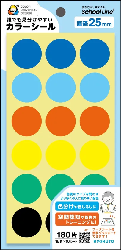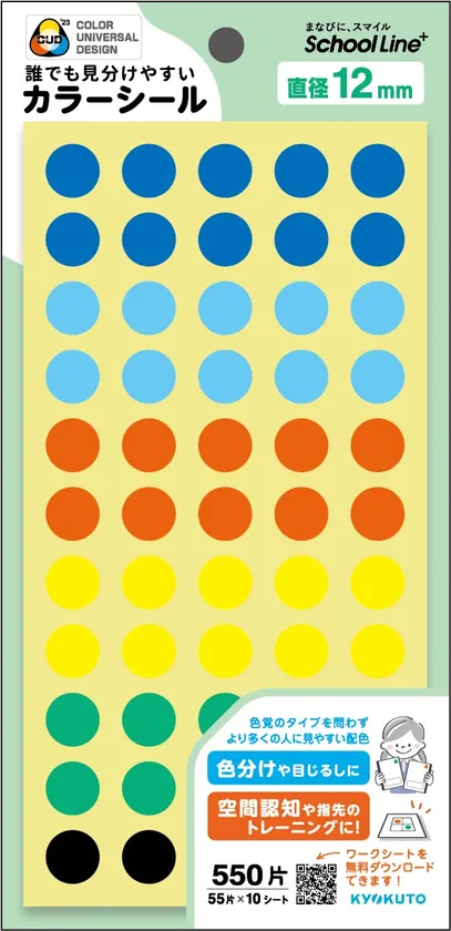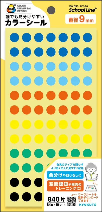 また、このシールは色覚の多様性に配慮し、NPO法人カラーユニバーサルデザイン機構の協力を得て「カラーユニバーサルデザイン推奨配色セット制作委員会」の色彩値を反映させています。色覚のタイプを問わず、誰もが公平に見える配色のアソートのシールですので、教室や事務室、図書館などで「識別用のカラーラベル」としても使用していただけます。