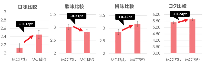 一般的に、オイル(油分)が入るとコクや旨味などがアップするといわれている中で、今回のMCTオイルにおいても甘味・旨味・コクをアップしてくれることが確認されました。また、トマトのような酸味のある食材に対しては、その味をまろやかにするはたらきがあるということが結果から伺えます。