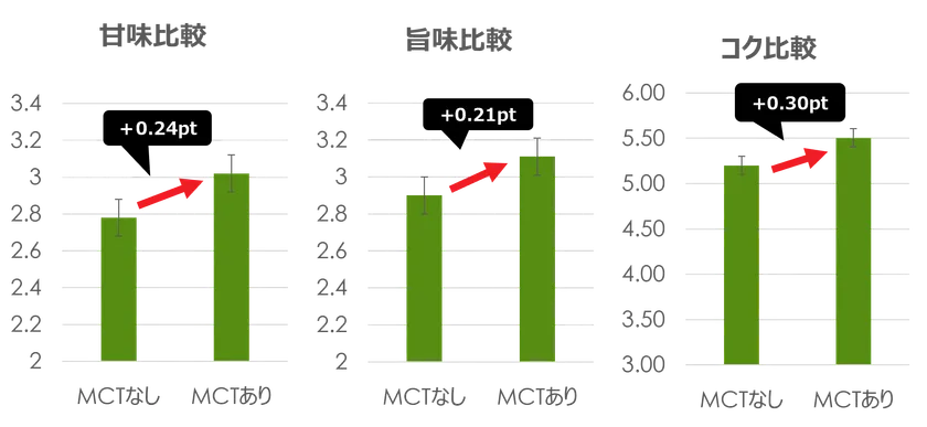 「MCTオイルを加えることで、甘味、旨味、コクが有意にアップしています。どちらも、オイルが持つ脂溶性の性質によって隠れていた旨味と甘味が引き出されたと考えられます。また「MCT SOUP完熟トマトポタージュ」に関してはトマトの酸味が抑えられていることで、口に入ったときによりまろやかさを感じやすくなると言えるでしょう。」