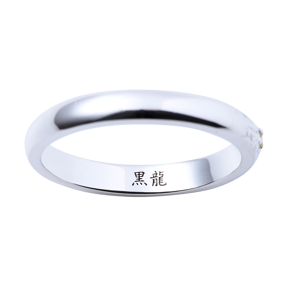 甲丸フォルムのリングに弾痕と黒龍のモチーフを取り込み、イメージカラーのイエローサファイヤをセット。内側には「黒龍」を黒塗装で刻印しました。