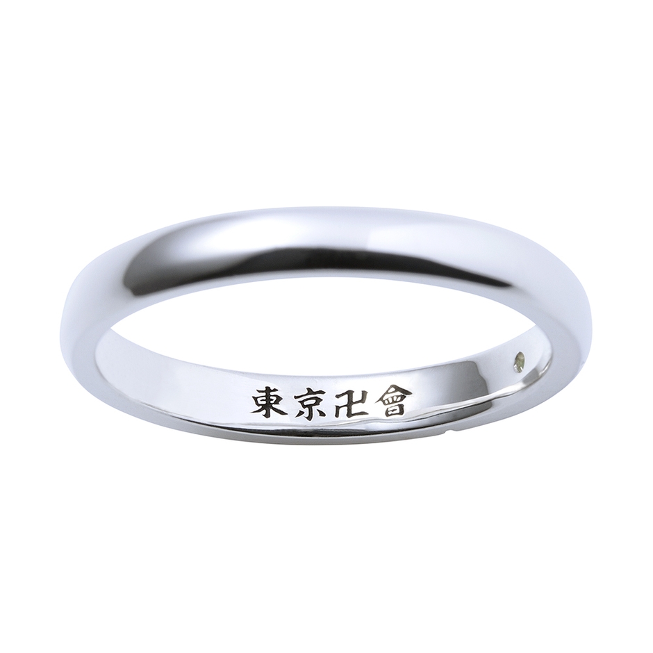 甲丸フォルムのリングに弾痕と髪の毛の剃り込みを取り込み、イメージカラーのサファイアをセット。内側には「東京卍會」を黒塗装で刻印しました。